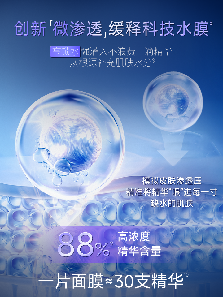 区别于传统面膜精华浮于表面、吸收低效的状况,维诗朵依托于水凝胶材料与膜体制备的核心发明专利,创新性地开发出微渗透缓释科技。专利水凝胶膜体如同一个“固态精华库”,能锁住高达88%的高浓度活性物。敷上脸后,它能模拟皮肤渗透压,形成微压动力,将组分占比高达98%的超小分子透明质酸(<10k Da)等活性成分持续、定向地“推”入肌底,直达真皮层,促进自身玻尿酸&胶原蛋白再生。