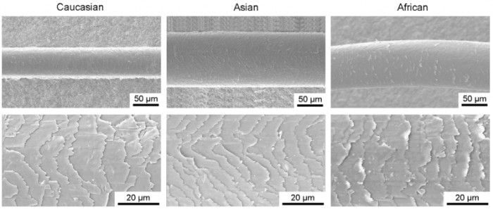 不同人种毛发的扫描电镜图像 (上排为整体形貌,下排为毛小皮局部结构)