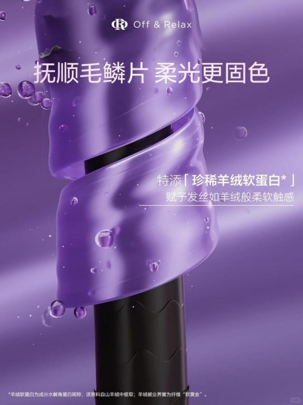 第二轴“发丝构光轴”层面,核心解决毛鳞片脱落所导致的发丝毛糙与失光的问题。Off&Relax采用珍稀羊绒软蛋白——其质地柔软顺滑,与健康发丝的天然触感高度相似,凭借独特的包裹性结构,能够精准渗透并与发丝表面紧密贴合。